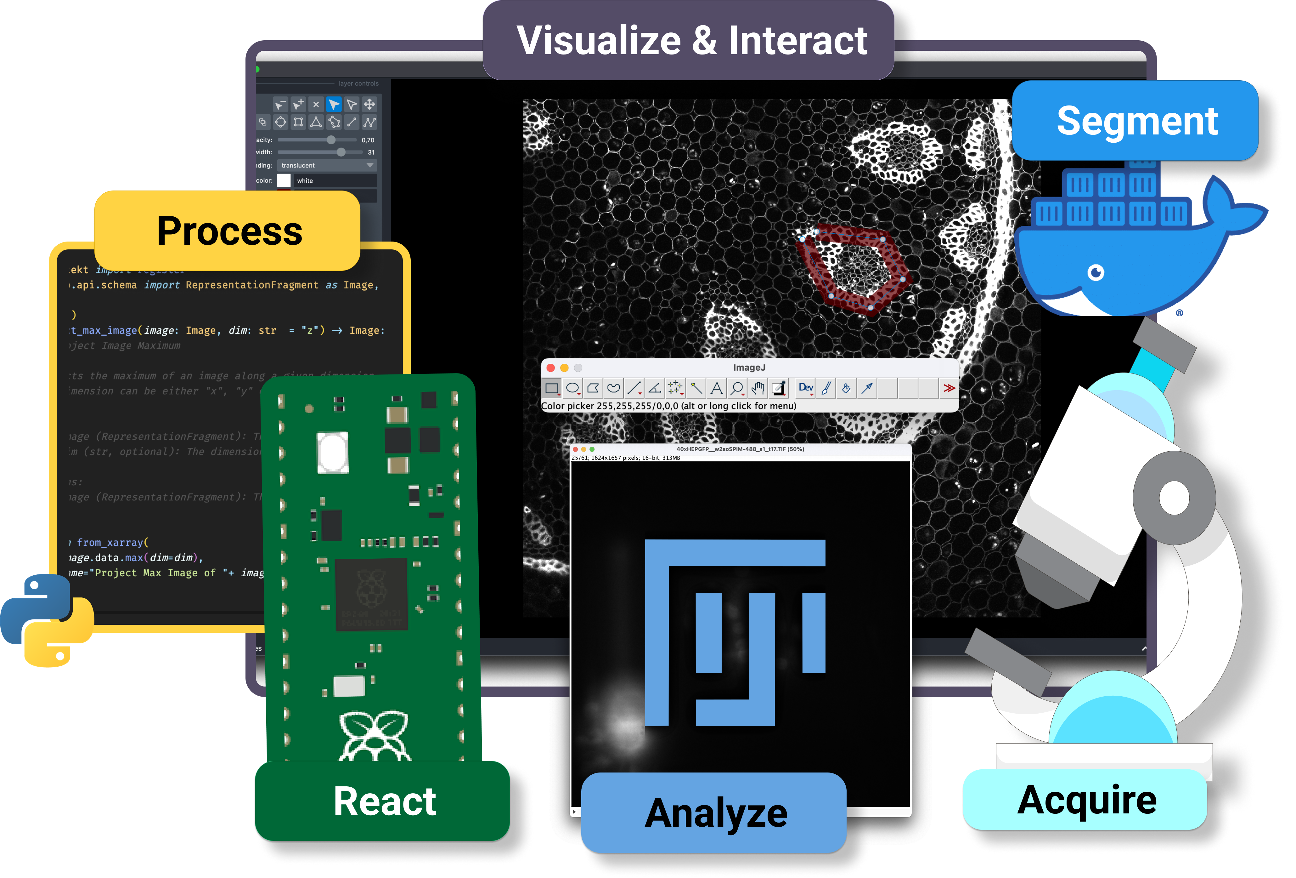 Arkitekt is a open source middleman that interactvs with your favorite bioimage tools, like Napari and Fiji, but also with your scripts and robotic devices.